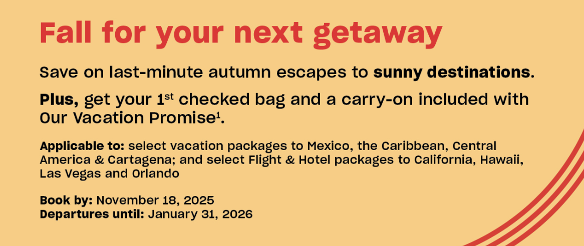 As the temperatures drop, Air Canada Vacations is turning up the heat with exclusive savings on last-minute fall getaways. Whether you’re craving a beach escape in Mexico or the Caribbean, a cultural break in Cartagena, or a quick adventure to California, Hawaii, Las Vegas, or Orlando, now is the perfect time to plan your next trip. Every package includes your first checked bag and carry-on under Our Vacation Promise, so you can travel light, easy, and worry-free.